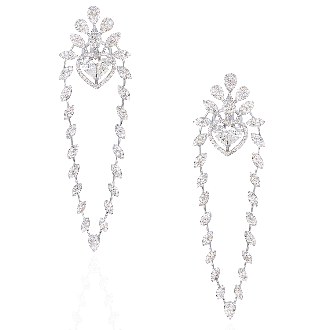 Minimal meets magnificent in Aurave Glow. These V-shaped chandelier earrings feature a sleek, cascading design anchored by a round-cut diamond top. Sculpted for movement and light, they bring just the right drama elegant, effortless, and evening-ready.