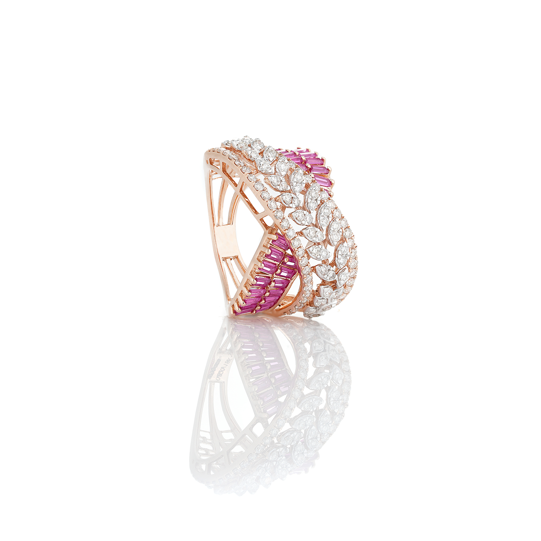 A striking X shaped ring where rubies and diamonds meet in perfect symmetry symbolizing balance, contrast and coonection.
