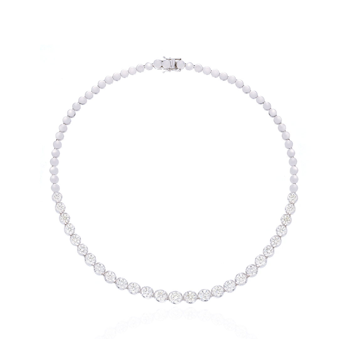 "The Lustre Line, a sleek diamond necklace crafted for modern minimalism. A seamless row of brilliant-cut diamonds flows effortlessly along the neckline, catching the light with every turn. It's elegance without excess—a timeless staple for everyday luxe."