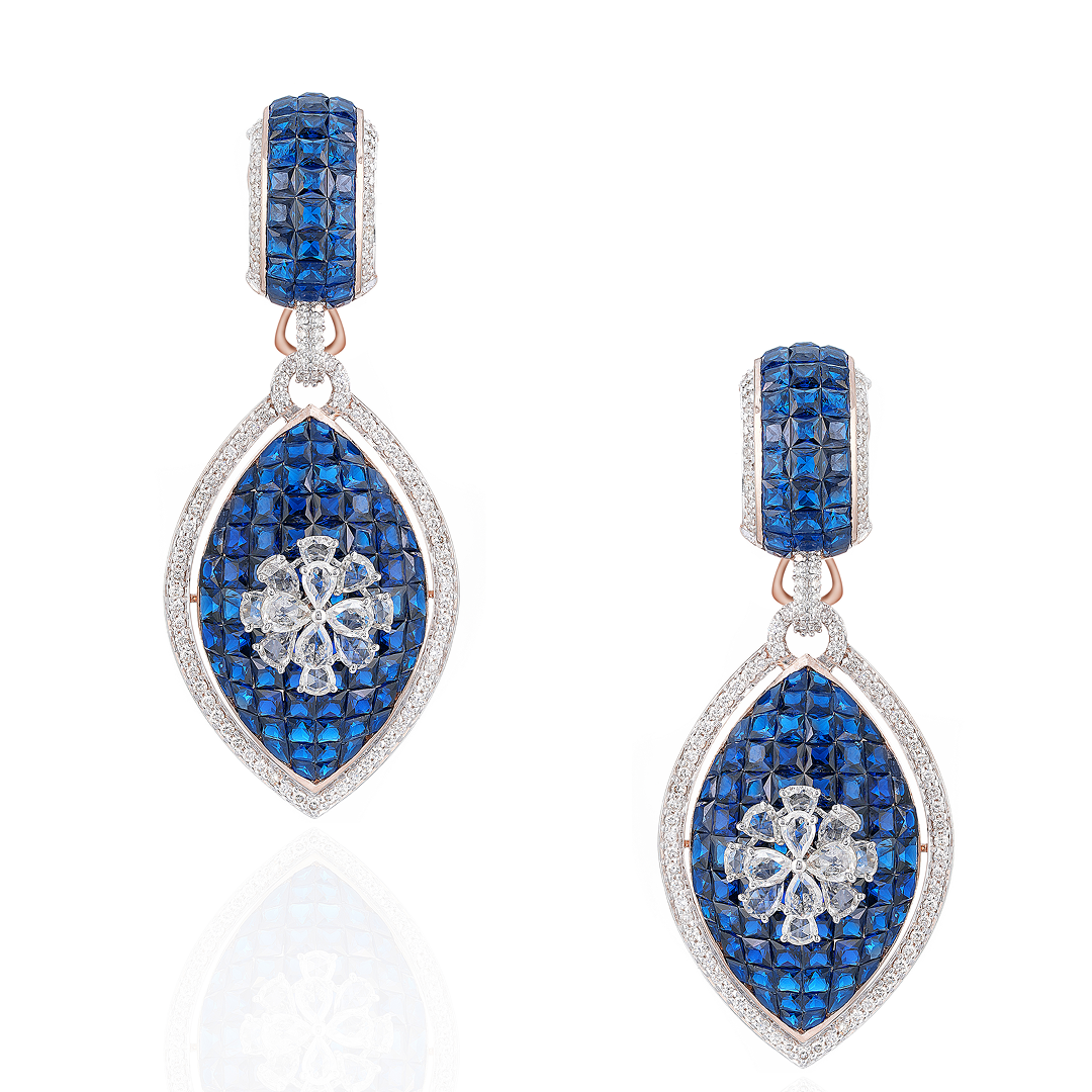 The Midnight Grace (A poetic play of depth and light, these long sapphire drop earrings captivate with their midnight hue and intricate craftsmanship. Shaped in rich blue sapphire, each drop cradles a radiant diamond flower at its heart like a bloom caught in twilight. Feminine, fluid, and unforgettable, they bring together regal color and delicate sparkle in one striking silhouette.