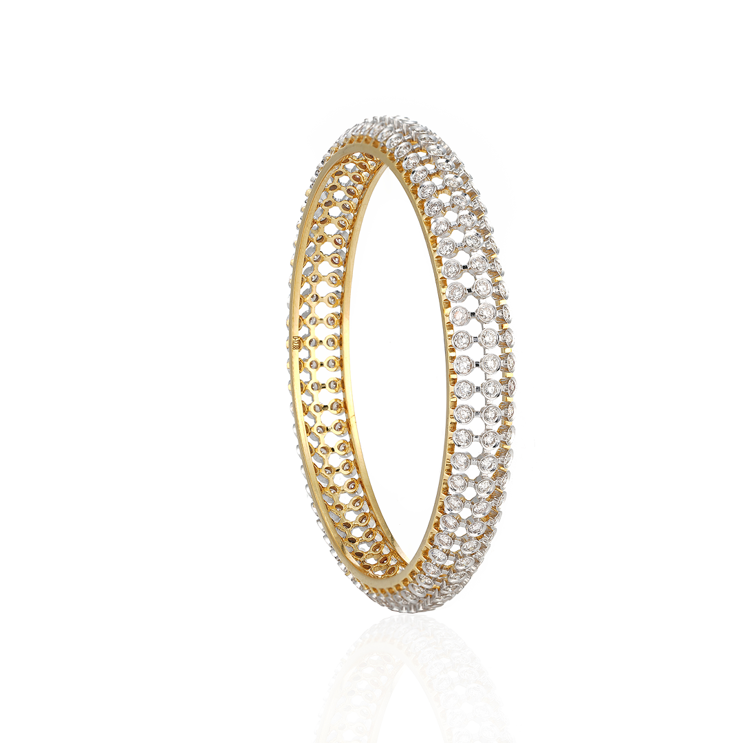 "The Sunset Hour, s a radiant celebration of contrast featuring a vertical stream of sunshine-hued yellow diamonds paired with icy white diamonds for a look that’s bold yet balanced. Set in a sleek silhouette, this bangle blends golden warmth with timeless brilliance. Designed for those who love their luxury with a twist of color and character."